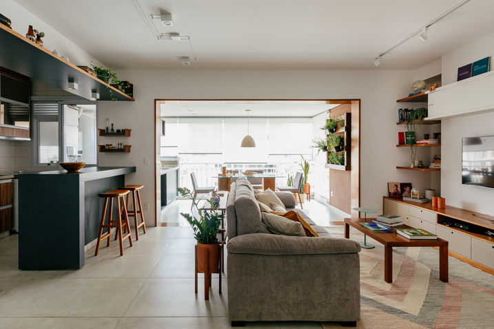 No apê Arizona o cliente queria integrar a varanda com a sala e um novo cantinho de home office.