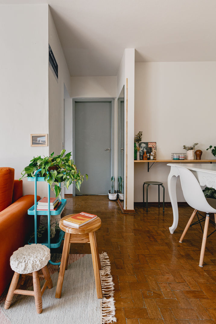 Esse é um daqueles casos “meu-primeiro-apê-alugado”, então, focamos em objetos e materiais com valores baixos e que trouxessem personalidade e muitas possibilidades futuras de serem reinventados.